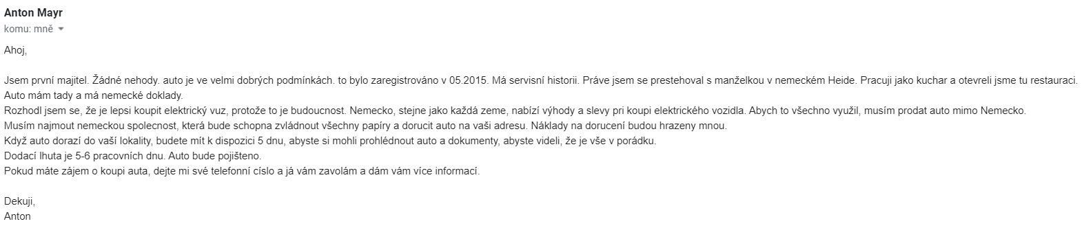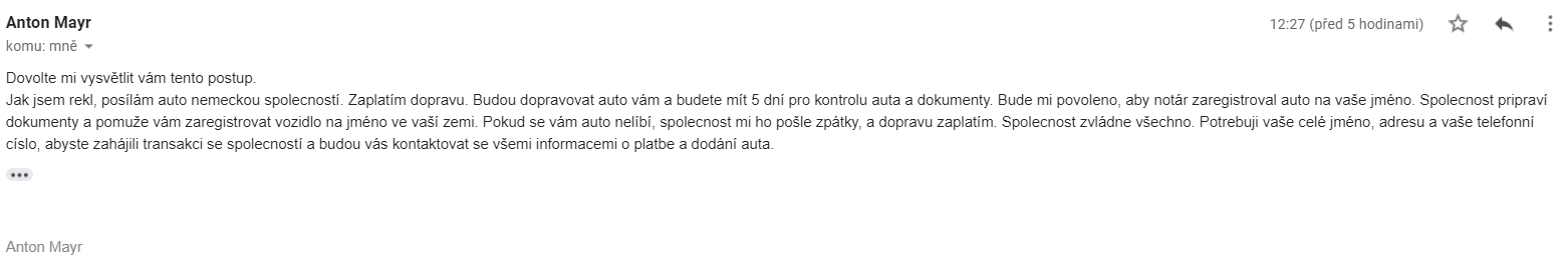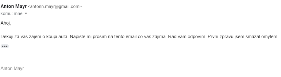 | Antonn Mayr | Německo | antonn.mayr@gmail.com | Audi | A4 | 202000 | inzerát |