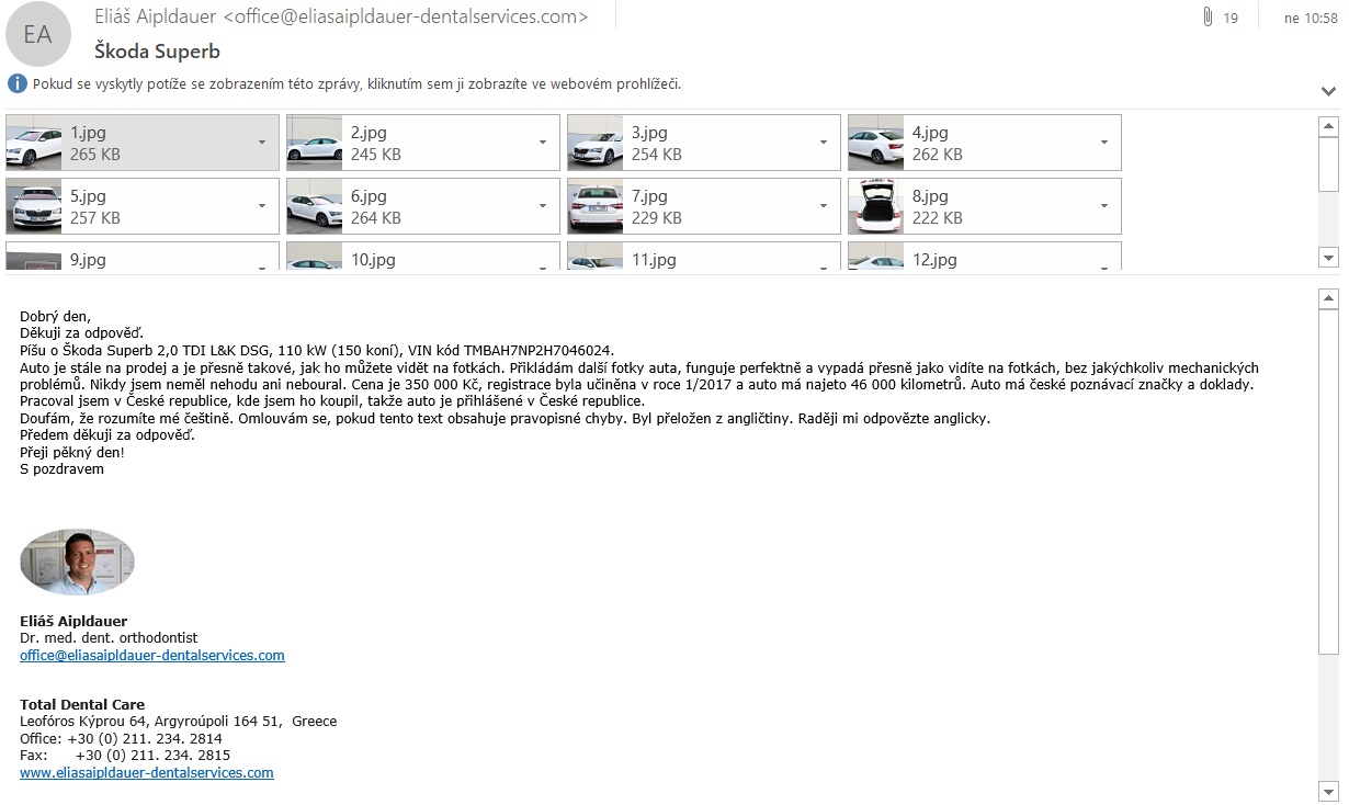 | Eliáš Aipldauer | Řecko | +30 (0) 211. 234. 2814 | office@eliasaipldauer-dentalservices.com | VW | Touran | 7C7 5334 | 399000 | DPD Speditions | |