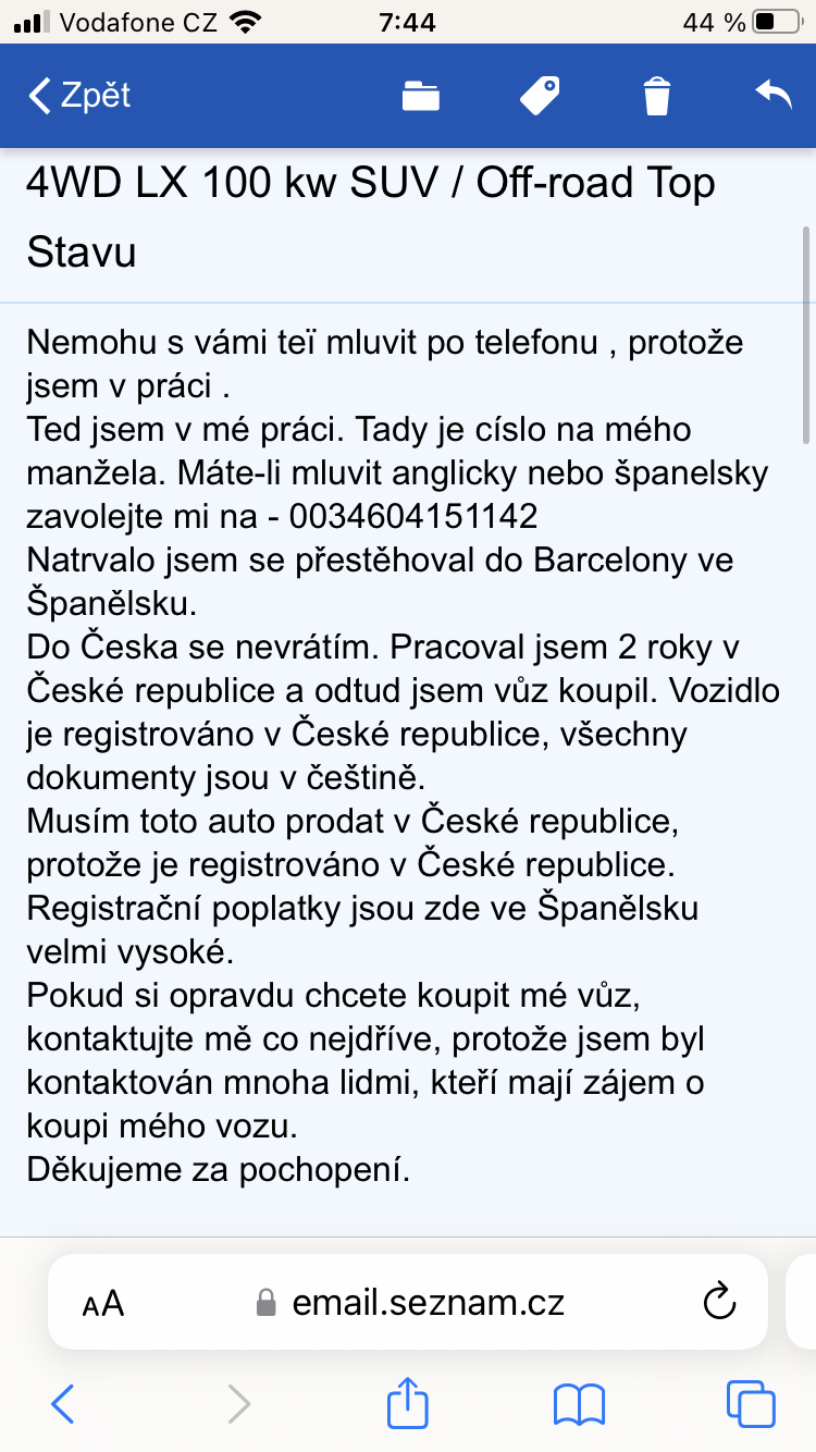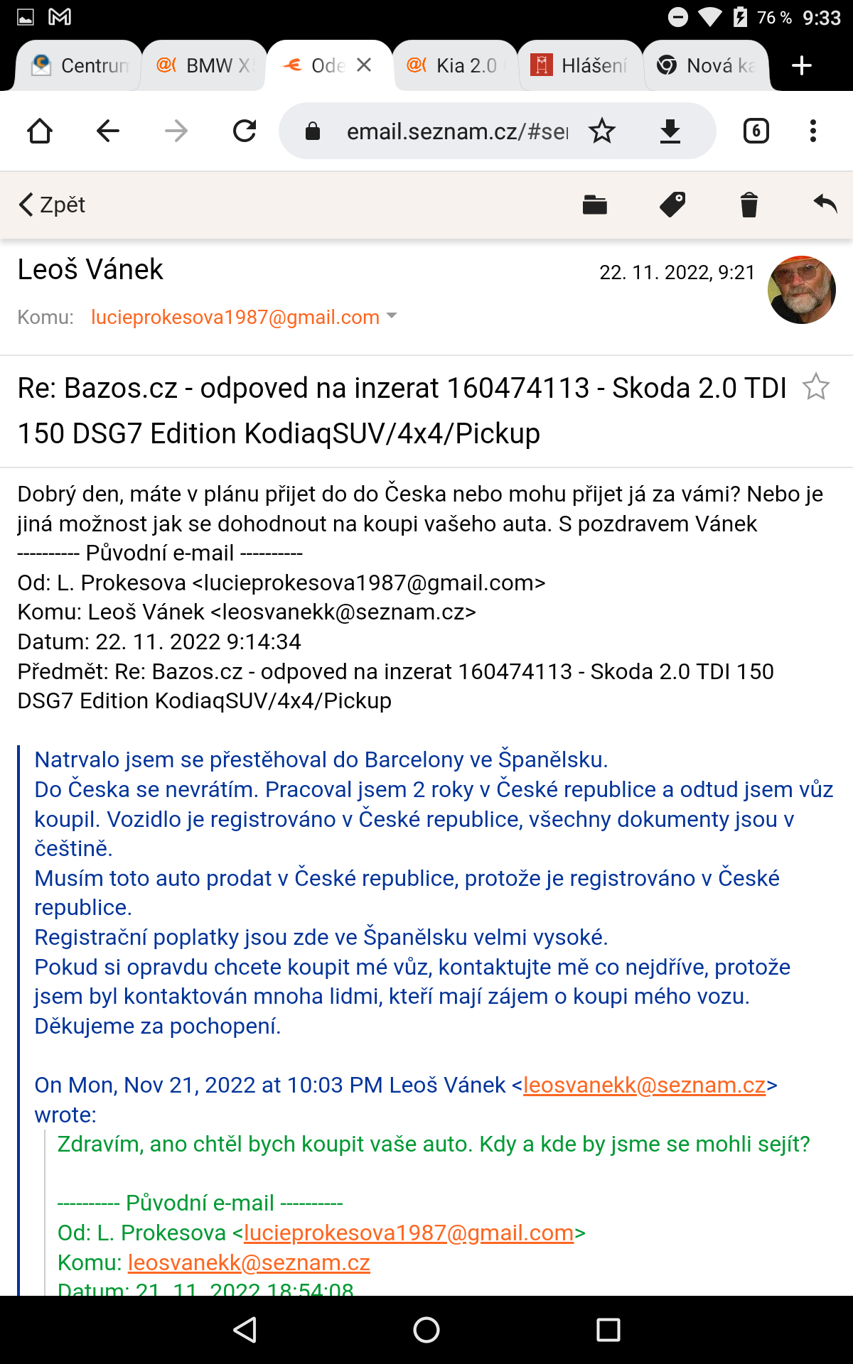 | Lucie Prokešová | Španělsko | lucieprokesova1987@gmai.com | Škoda | Superb | 4600 euro | info@marillotransport.com | Potvrzení o převodu Její občanka Historka |