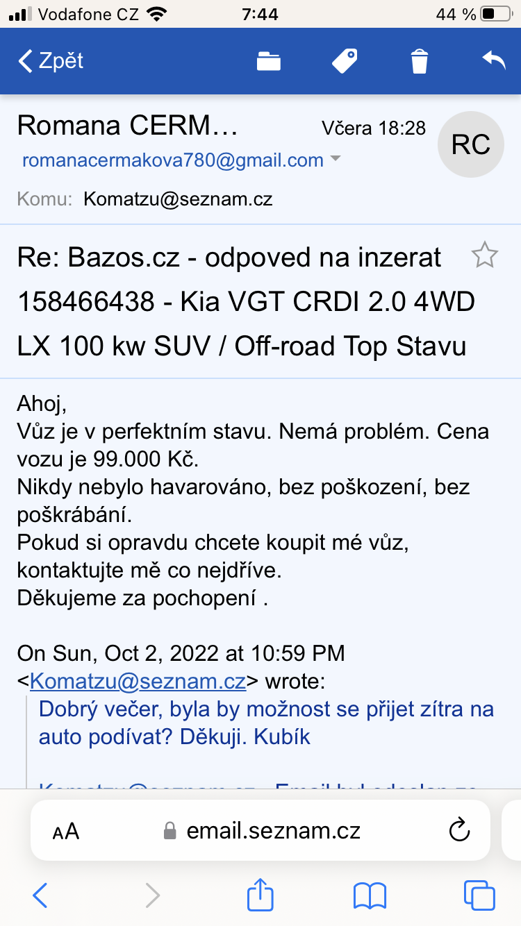 | Romana Čermáková | Španělsko | 0034604151142 | romanacermakova780@gmail.com | Kia | Sportage | 98999 | 84B8A138-B740-43BA-9986-36DF82CB2A08.png 2C96D410-AEA3-4F90-95FB-549358B48C04.png |