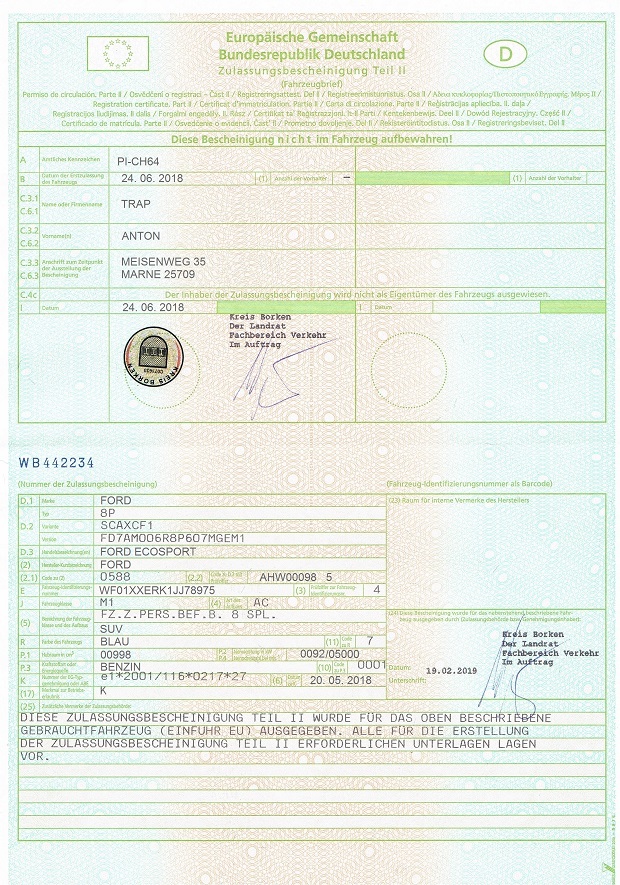 | Anton Trap | Česko | +491636754706 | anton.trap@peddm.com | Ford | Ecosport | PI-CH64 | 230000 | M.F.D.S Spedition GmbH | Kopie technického průkazu |