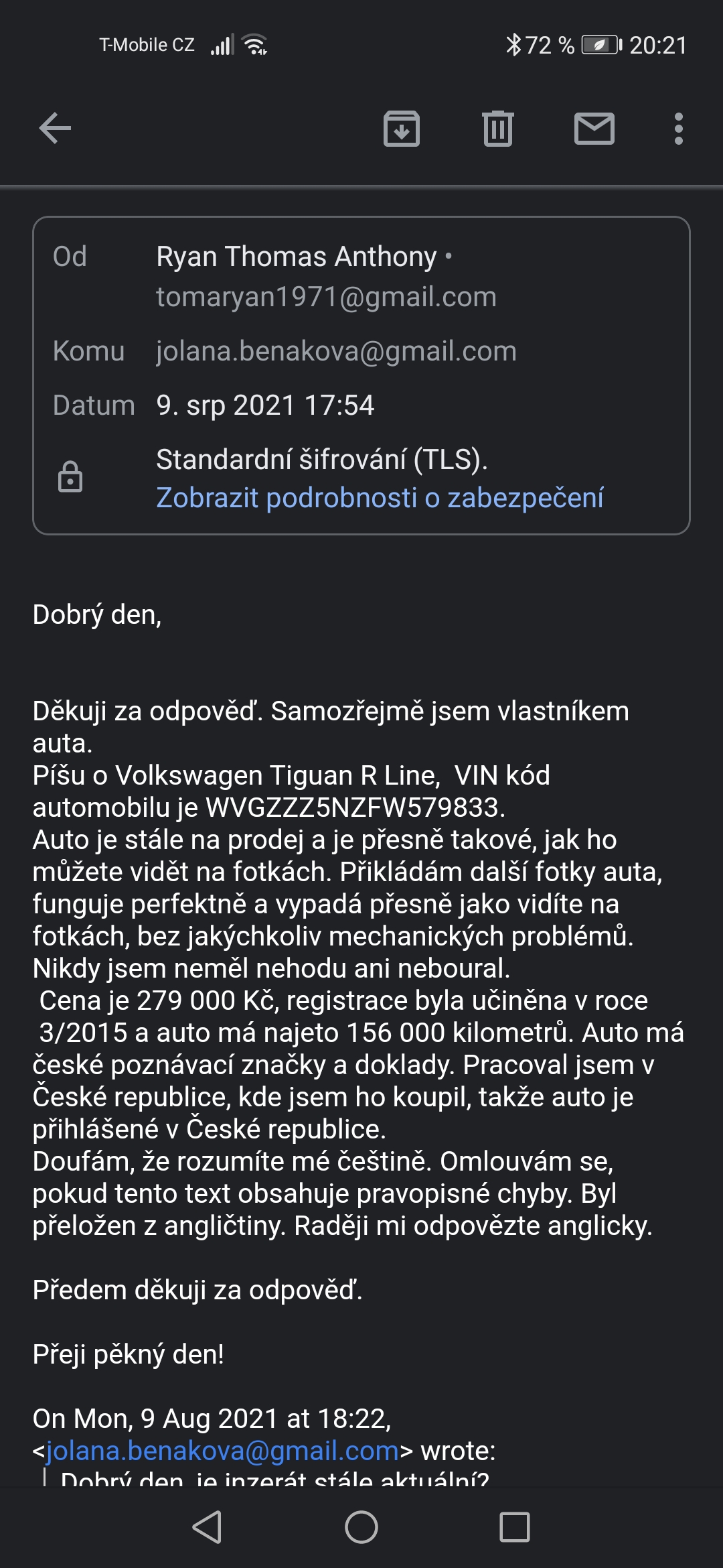 | Ryan Thomas Anthony | ČR | +420721682405 | tomaryan1971@gmail.com | VW | Tiguan | 4AP1464 | 279000 | Komunikace2 Komunikace1 |